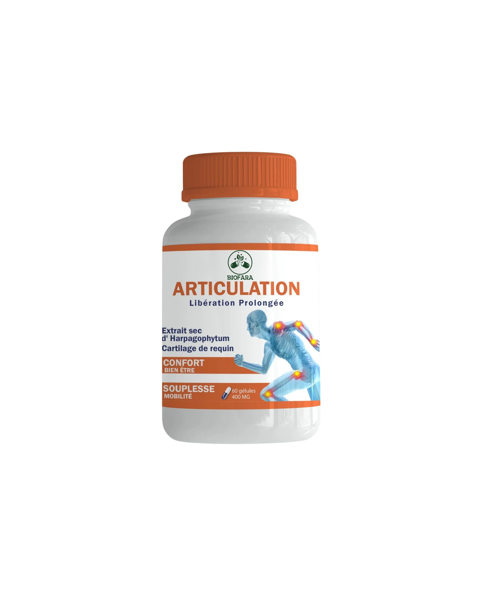 Découvrez Biofara Articulation, un complément alimentaire à libération prolongée spécialement formulé pour soutenir la santé articulaire et améliorer la mobilité. Enrichi en extrait sec d’Harpagophytum et en cartilage de requin, ce produit est conçu pour apporter confort, bien-être et souplesse à vos articulations. Avec 60 gélules de 400 mg chacune, il est idéal pour ceux qui cherchent à maintenir une mobilité optimale et à réduire l’inconfort articulaire.